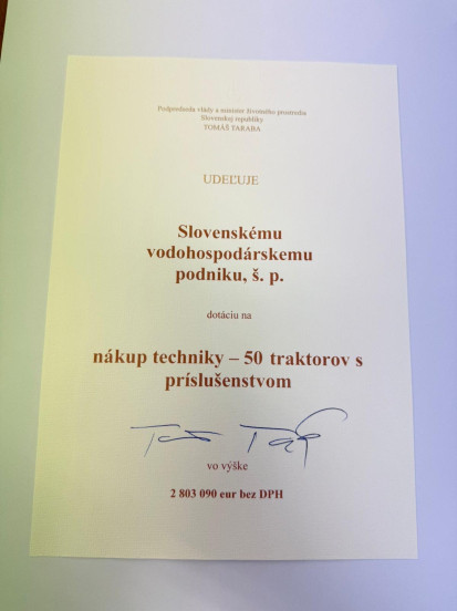 SLOVENSKÝ VODOHOSPODÁRSKY PODNIK, štátny podnik (ďalej len SVP, š. p.) v roku 2025 realizoval obnovu časti technického vybavenia prostredníctvom nákupu 50 kusov kolesových traktorov s príslušenstvom, určených na výkon činností súvisiacich so správou a údržbou vodných tokov a vodných stavieb.